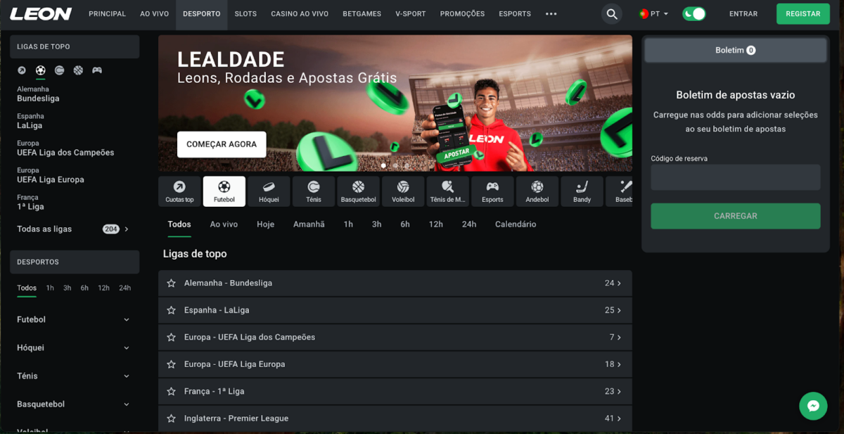 Entre esses sites, a LEON Bet Portugal aparece como uma opção bastante completa, tanto para quem faz bilhetes simples quanto para quem prefere apostas múltiplas. O ambiente é leve, as odds atualizam rápido e existe uma boa variedade de mercados. Além disso, a LEON disponibiliza um aplicativo móvel, que torna as apostas ainda mais práticas para quem prefere apostar diretamente pelo celular. Quem pretende explorar campeonatos internacionais encontra uma secção dedicada de apostas de futebol, e quem acompanha competições locais pode navegar diretamente pela página de Primeira Liga Apostas.
